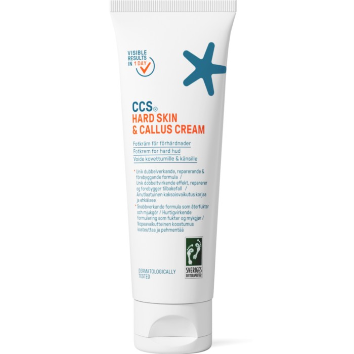CCS Hard Skin & Callus Cream är en fotkräm för förhårdnader. Krämen hjälper till att reparera hård hud och förhårdnader samt skyddar hudbarriären och förebygger återkommande besvär.
