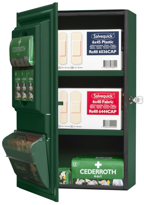 Cederroth Första Hjälpen-skåp är anpassat för arbetsplatser som behöver ha första hjälpen-utrusning till hands. Första Hjälpen-skåp Mini är ett mindre plåtskåp med Cederroth Lilla Första Hjälpen-tavla monterad på dörren. I det låsbara skåpet förvaras påfyllningsartiklar.