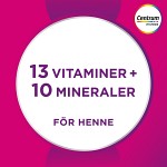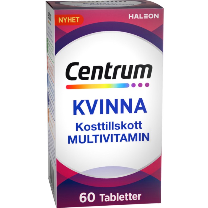 Centrum Kvinna Multivitamin är ett kosttillskott utvecklat för att stödja kvinnors näringsbehov. Centrum Kvinna innehåller 13 vitaminer och 10 mineraler. Vitamin A, vitamin B12, vitamin C och folsyra bidrar till immunsystemets normala funktion. Vitamin B12 och vitamin B6 bidrar till en normal energiomsättning och bidrar till minskad trötthet och utmattning. Vitamin D, magnesium och kalcium bidrar till att bibehålla normal muskelfunktion och normal benstomme. Järn bidrar till normal bildning av röda blodkroppar och hemoglobin. Pantotensyra bidrar till normal mental prestationsförmåga. Centrum Kvinna har ett högt innehåll av vitamin D. En tablett per dag.