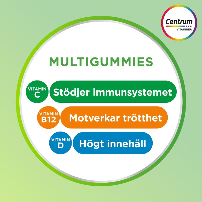 Centrum Multivitamin Gummies för vuxna är ett kosttillskott med vitaminer och mineraler. Dessa gummies har en smak av apelsin och är framtagna för vuxna som önskar ett tuggbart alternativ till vanliga vitamintabletter. Dessa gummies innehåller 10 vitaminer och mineraler, bland annat vitamin D, vitamin C, och vitamin B. 2 gummies per dag.