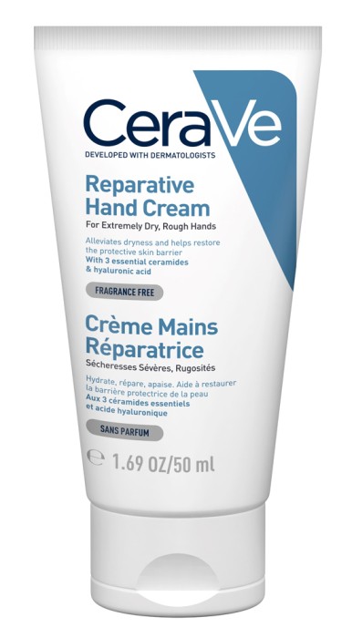 CeraVe handkräm innehåller essentiella ceramider och hyaluronsyra och minskar känsla av torrhet i huden samt bidrar till att stärka hudens skyddande barriär.