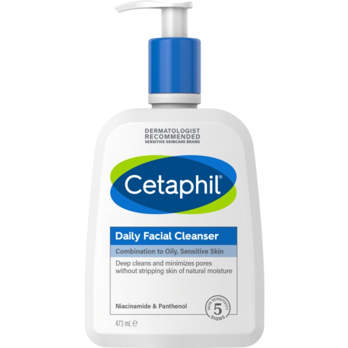 Cetaphil Daily Facial Cleanser är en lätt löddrande rengöringsgel för ansiktet som passar kombinerad, fet och känslig hud. Rengör skonsamt och effektivt huden på djupet och minimerar porerna utan att ta bort hudens naturliga fukt. Daily Facial Cleanser innehåller fuktbevarande glycerin, niacinamid som hjälper till att stärka hudbarriären och pantenol som minskar fuktförlust och gör huden mjuk och smidig.