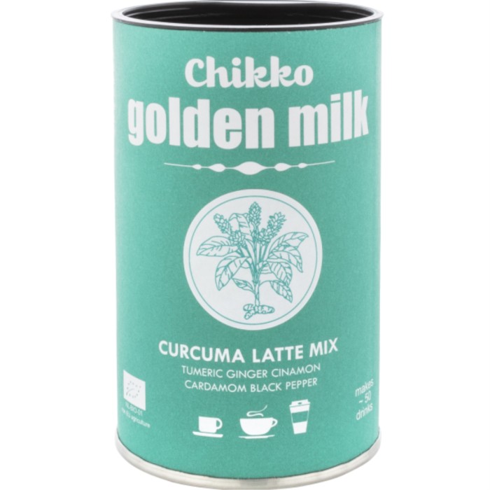 Chikko Golden Milk Curcuma Latte Mix är en kryddmix utan tillsatt socker som du använder för att blanda en varm dryck. Pulvret innehåller ekologisk gurkmeja (63 %), ingefära, kanel, kardemumma och svartpeppar och blandas med varmt vatten och varm skummad mjölk.