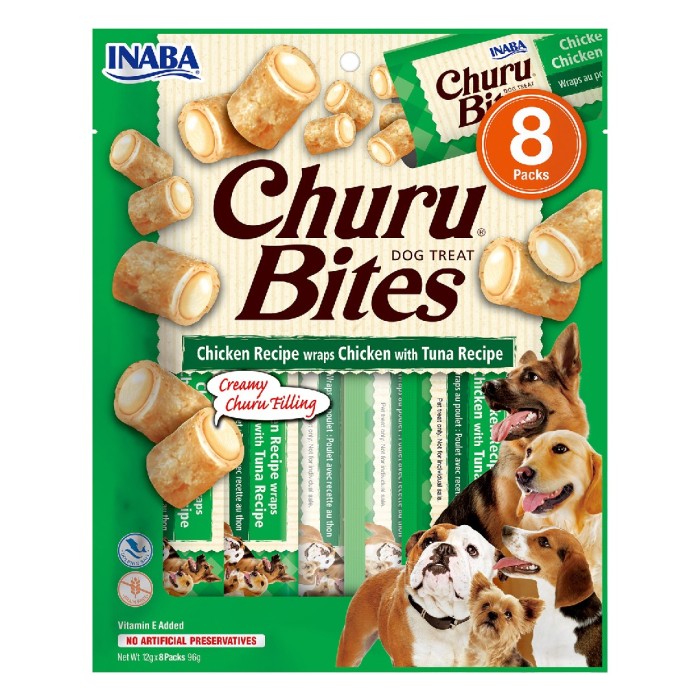 Churu Bites Dog Treat Chicken Wraps with Tuna är mjuka, kuddformade kycklingbitar smaksatta med naturliga smaker. Innehåller även grönt te-extrakt och vitamin E. Ge till hunden som godis eller belöning.