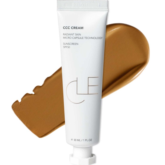CCC Cream (Color Control & Change Cream) från CLE är en lätt allt-i-ett primer och foundation med SPF 50. Den innovativa BB- och CC-cream-hybriden är framtagen med Micro Capsule Teknologi vilket gör att att formuleringen smidigt smälter in i huden och jämnar ut hudens struktur. CCC Cream ger en daggig, återfuktad hud och har en lätt men byggbar täckning som ger huden fin lyster. Nyans: Warm Medium Deep 401.