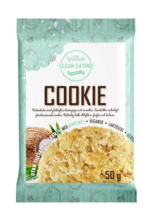 Clean Eating Cookie Kokosnöt är en kokoskaka på 50 gram som är gjord på bland annat glutenfria havregryn och mandlar. Kokoskakan kanske passar perfekt till fikat, eller som ett mellanmål.