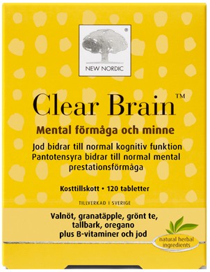 Clear Brain är ett kosttillskott som innehåller en kombination av örtextrakt, vitaminer och mineraler. Clear Brain innehåller jod som bidrar till normal kognitiv funktion samt pantotensyra som bidrar till normal mental prestationsförmåga.