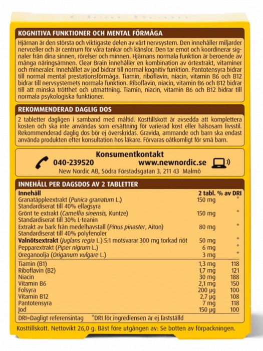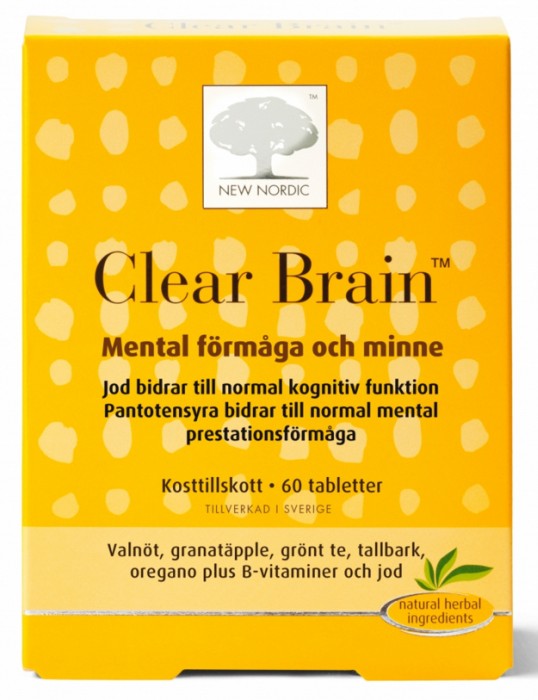 Clear Brain är ett kosttillskott som innehåller en kombination av örtextrakt, vitaminer och mineraler. Clear Brain innehåller jod som bidrar till normal kognitiv funktion samt pantotensyra som bidrar till normal mental prestationsförmåga. Med tiamin, riboflavin, niacin, vitamin B6 och B12 som bidrar till nervsystemets normala funktion.