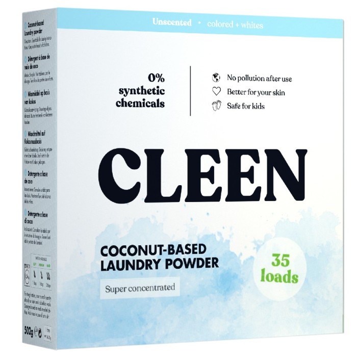 CLEEN tvättmedel är baserat på RSPO-certifierad kokosolja. Tvättmedlet kan användas för både vittvätt och kulörtvätt. Vid svåra fläckar rekommenderas det att gnida tvättmedlet på fläckarna före tvätt. Inget sköljmedel behöver användas. Förpackningen är biologiskt nedbrytbart och du får inte med någon plastskopa.