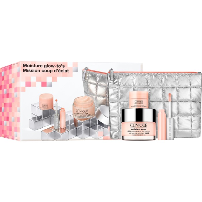 Clinique Moisture Glow-To's är en set med tre hudvårds- och sminkprodukter som får dig att stråla. Setet innehåller en fuktkräm, ett läppglans och en ögonkräm.