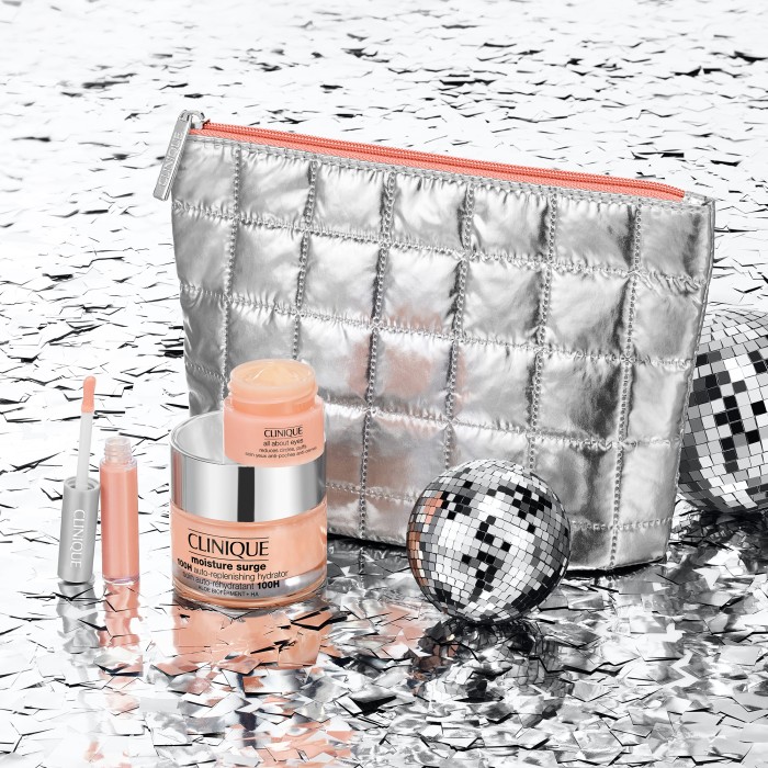 Moisture Surge™ 100H Auto-Replenishing Hydrator är en fuktkräm som bekämpar daglig torrhet. Den lätta gelkrämen absorberas snabbt och ger en intensiv och varaktig återfuktning, vilket gör huden mer motståndskraftig och ger den lyster. Clinique Pop Plush™ Lip Gloss är ett läppglans som ger dina läppar en hög glans och återfuktning som varar hela dagen. Nyansen heter Airkiss Pop och är en genomskinlig, blekrosa färg med en lätt skimrande effekt. All About Eyes™ är en ögonkräm som över tid reducerar synligheten av puffighet och mörka ringar under ögonen.
