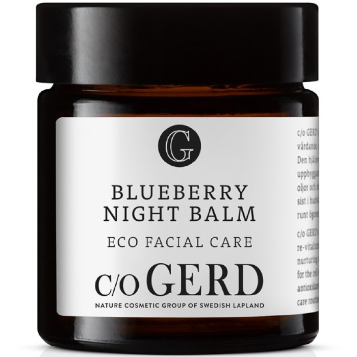 Blueberry Night Balm är en rik och närande nattbalm som hjälper till att kapsla in fukt i huden under natten och ökar hudens elasticitet. c/o Gerds nattkräm Innehåller fina ekologiska råvaror som vårdande oljor, samt antioxidantrik blåbärsfröolja. Den ger huden en mjuk och slät känsla.