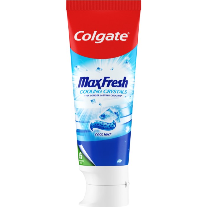 Colgate Max Fresh innehåller uppfriskande kristaller som fräschar upp din mun. Tandkrämen kombinerar en stark mintsmak med ett mycket friskt gel för maximal fräschhet. Formulan innehåller kisel som rensar tänderna och fluor som skyddar mot hål i tänderna.