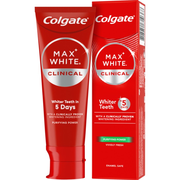 Colgate Max White Clinical Purifying Power är en tandkräm som ger vitare tänder på bara 5 dagar. Tandkrämen innehåller väteperoxid och micellär rengöringsteknik för att ta bort orenheter från tänderna. Fräsch smak.