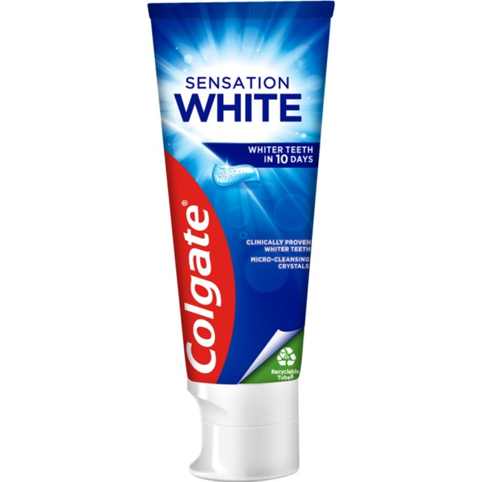Colgate Sensation White är en fluortandkräm som innehåller rengörande mikrokristaller som skonsamt polerar tänderna för att hjälpa till att bibehålla tändernas naturliga färg. Tandkrämen hjälper också till att förebygga nya fläckar och motverkar plack och karies.