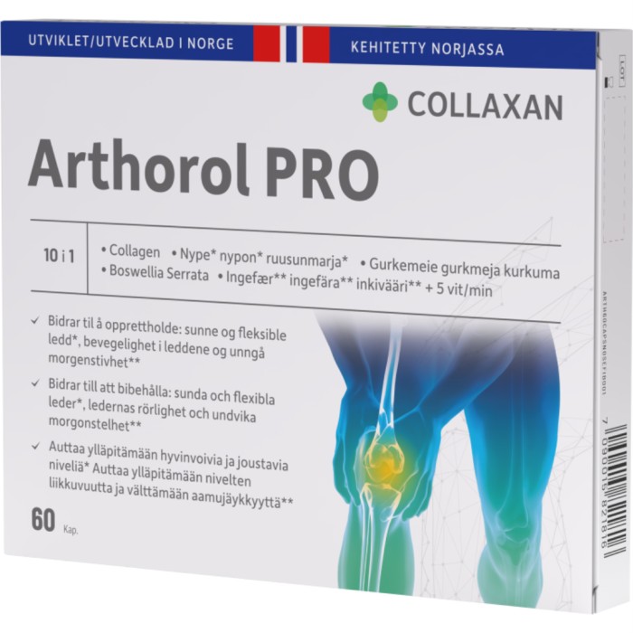 Arthorol Pro från Collaxan är ett kosttillskott som innehåller kollagen från äggskalsmembran (OvoMet®), nypon, boswellia serrata, mangan, vitamin C och ingefära. Mangan bidrar till att bibehålla normal benstomme och bidrar till normal bildning av bindväv. Vitamin C bidrar till normal kollagenbildning som har betydelse för benstommens och broskets normala funktion.