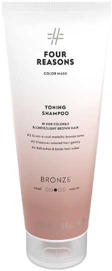 Four Reasons Color Mask Toning Shampoo Bronze är ett skonsamt hårschampo speciellt framtaget för färgat hår. Schampot innehåller vårdande veteprotein och pantenol (vitamin B5) och balanserande pigment som bidrar till att skydda hårfärgen och det skyddar håret från UV-strålar.