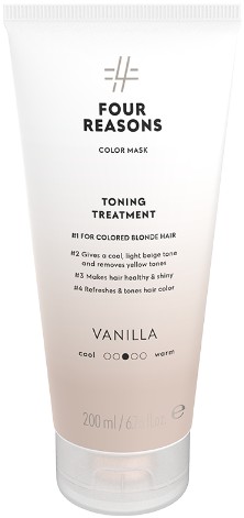 Four Reasons Color Mask Toning Treatment är en tonande, reparerande och återuppbyggande hårinpackning för färgat hår. Inpackningen återupplivar hårfärgen, stärker färgbehandlat hår och ger håret glans. Hårinpackningen är berikad med växtbaserat protein, aminosyror och hydrolyserad quinoa. Alla nyanser går att mixa med varandra för att få en helt egen nyans. Vegansk.