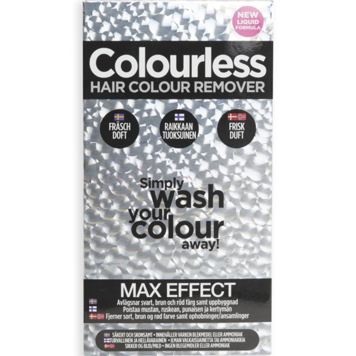 Colourless Max Effect Hair Colour Remover avlägsnar permanent och semi-permanent hårfärg. Innehåller aktiva ingredienser för att eliminera envis uppbyggnad av mörka färger. Denna ultra-starka formulering tar bort svart, röd, brun, mörkblond hårfärg.