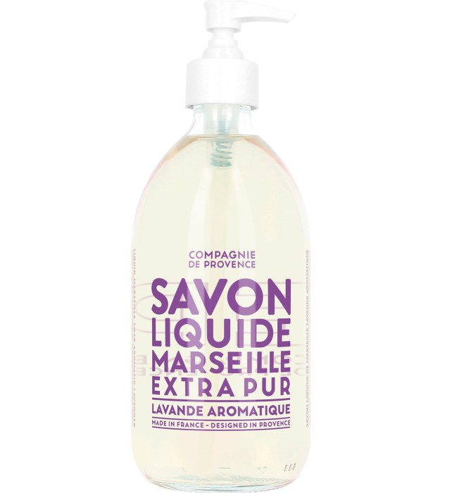 Liquid Marseille Soap Aromatic Lavender från Compagnie de Provence pumptvål i flaska med 495 ml. Denna ultrarika flytande tvål har förtvålats i en kittel, enligt en traditionell metod, och berikats med botaniska oljor från Provence. Tvålen har en doft av lavendel - en aromatisk och mycket elegant doft.