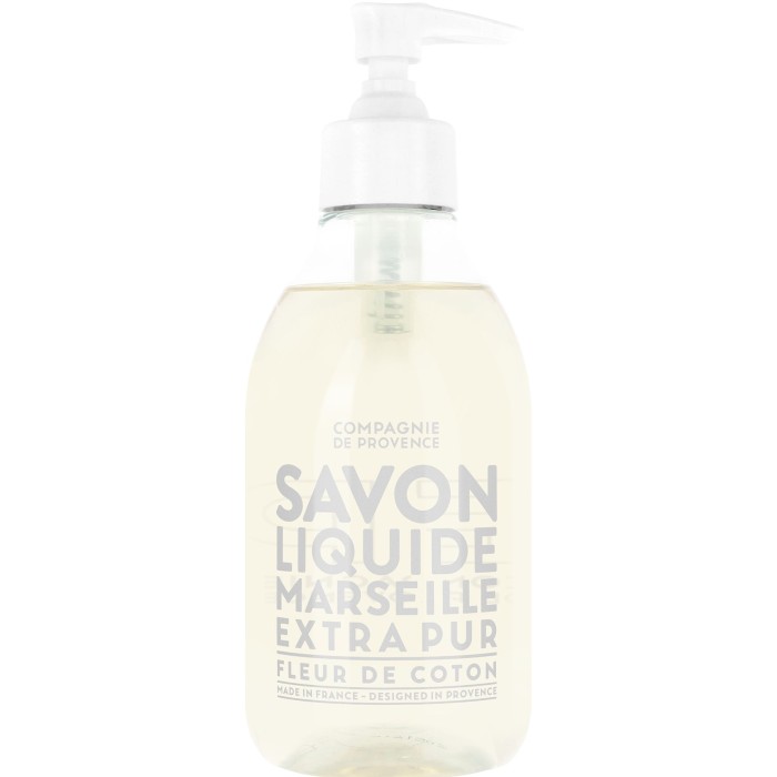 Liquid Marseille Soap Cotton Flower från Compagnie de Provence är en flytande Marseille-tvål som rengör huden skonsamt. Denna ultrarika flytande tvål förtvålas i en kittel enligt en traditionell metod och är berikad med botaniska oljor från Provence. Tvålen är naturligt rik på glycerin och är formulerad med kokosolja och ger ett fint, rikt lödder. Gör att huden känns mjuk varje gång du använder den.