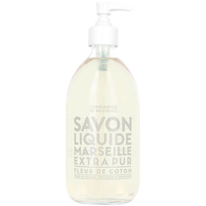 Liquid Marseille Soap Cotton Flower från Compagnie de Provence i pumpflaska 495 ml. Denna ultrarika flytande tvål är förtvålad i en kittel enligt en traditionell metod och är berikad med botaniska oljor från Provence. Denna sulfatfria tvål är naturligt rik på glycerin och innehåller kokosolja. Ger ett fint, fylligt lödder och gör att huden känns mjuk vid varje användning.