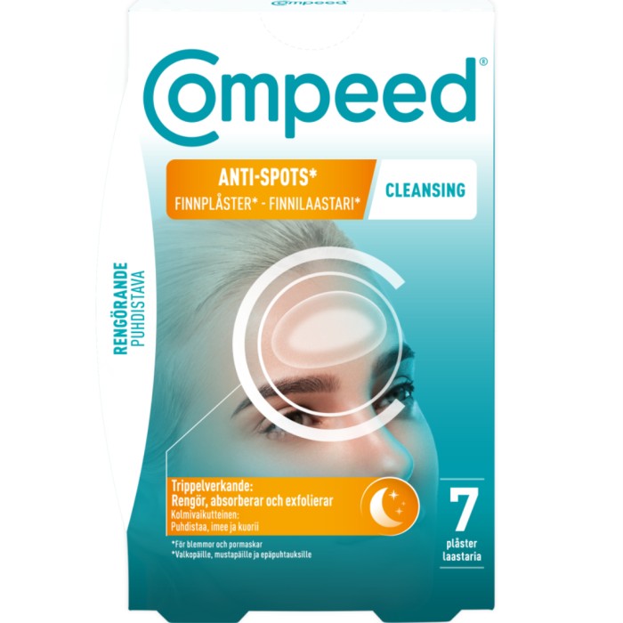 Compeed Cleansing finnplåster* är trippelverkande för att rengöra, absorbera och exfoliera pormaskar, blemmor och orenheter. Utformat för större områden där blemmor kan förekomma.