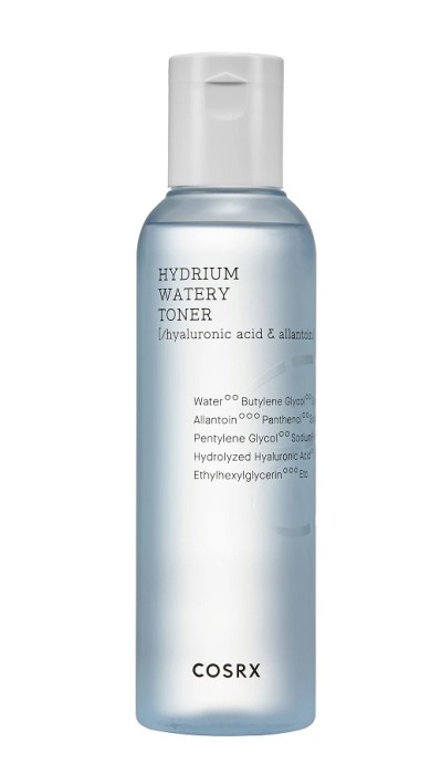 COSRX Hydrium Watery Toner är en fuktighetstoner med vitamin B5 och hyaluronsyra som gör din hud fräschare och tillför fukt. Kan användas som ett ansiktsvatten som första steget i din hudvårdsrutin efter rengöring, men kan också användas för att blöta bomullsrondeller och lägga på ansiktet som en "toner-mask".