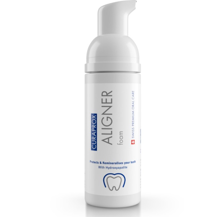 Curaprox Aligner Foam re-miniraliserar och skyddar tänderna, bekämpar plack och agerar skyddande mot dålig andedräkt under behandling med aligner. Skummet för tandskenor återuppbygger, skyddar och remineraliserar med naturliga mineraler, och skapar en återfuktande hinna. Ett tillbehör för att skydda tänderna bakom tandskenor, retainers eller bettskenor.