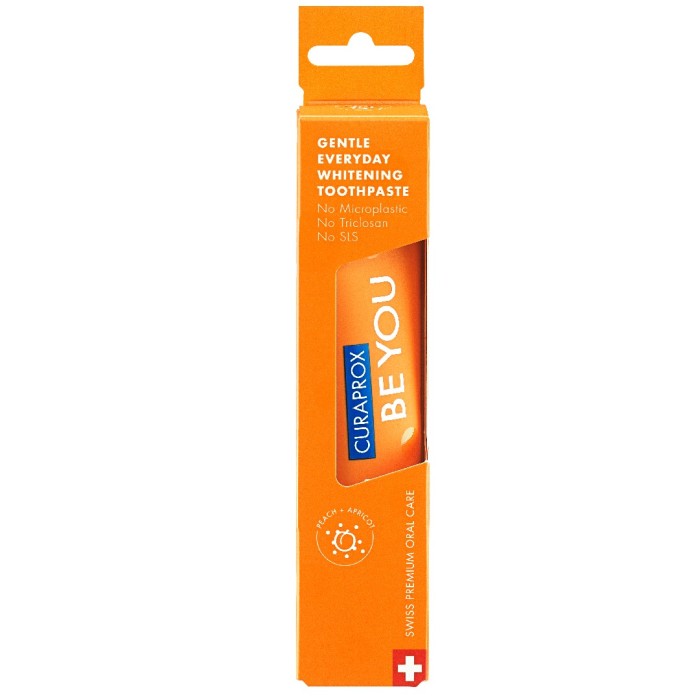 Curaprox BE YOU whitening-tandkräm med smak av persika och aprikos.