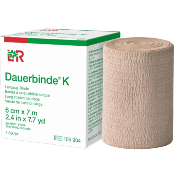 Dauerbinda K kraftig är en elastisk binda som används vid akut kompression vid stukningar och idrottsskador. Används för att ge stöd under en viss tid, men ej på natten. Används även för behandling vid trombosprofylax och venösa problem. Kompressionsbindan ger kompression, stöd, avlastning och fixation. Kan användas i förebyggande syfte vid bl a fysisk aktivitet.