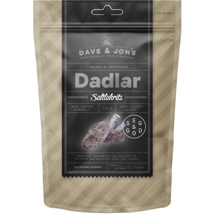 Dave & Jon's Dadlar Saltlakrits är sega dadlar smaksatta med saltlakrits. En naturlig snack utan tillsatt socker. Kanske ett bra litet tilltugg när du behöver ny energi eller vill unna dig något gott som inte är godis. Smakar riktigt salt!