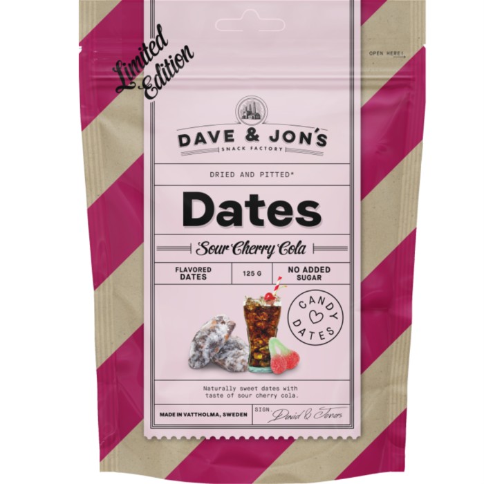 Dave & Jon's Dadlar Sour Cherry Cola är naturligt söta dadlar med smak av sur-syrlig Cherry Cola. Dadlarna innehåller endast naturligt förekommande sockerarter och inget tillsatt socker eller sötningsmedel.