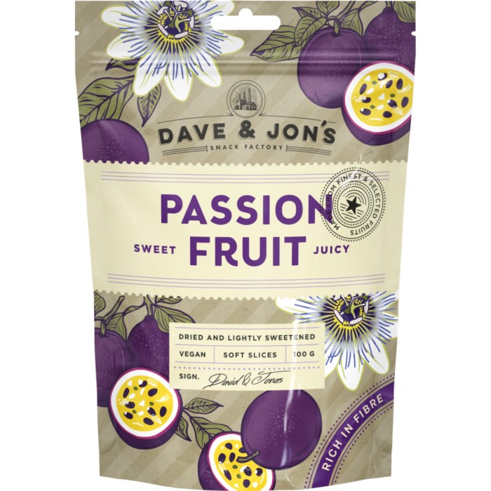 Dave & Jon´s Passionsfrukt är en snack med tropisk smak i form av torkad passionsfrukt sötad med socker.