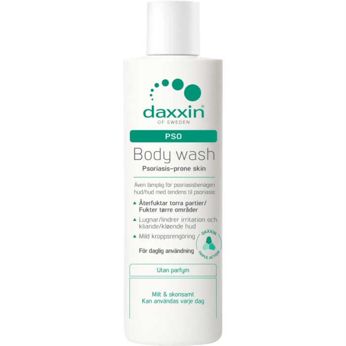 Daxxin PSO Body Wash är en effektiv och mild kroppsrengöring som återfuktar torra hudpartier och lugnar huden. Daxxins tvål är så mild att det kan användas dagligen.