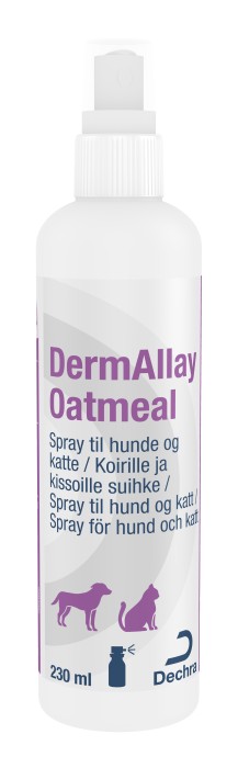 DermAllay Oatmeal Spray är en återfuktande balsamspray till hund och katt. Sprayen innehåller ceramider som kan stöttta en skadad hudbarriär.