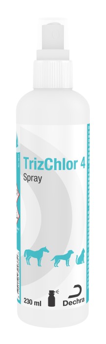 TrizChlor 4 Spray är en fuktbevarande spray avsedd för hundar, katter och hästar. TrizChlor 4 spray innehåller klorhexidin som har en hämmande effekt på bakterier och svampar. Sprayen innehåller dessutom EDTA som förstärker klorhexidinets effekt.