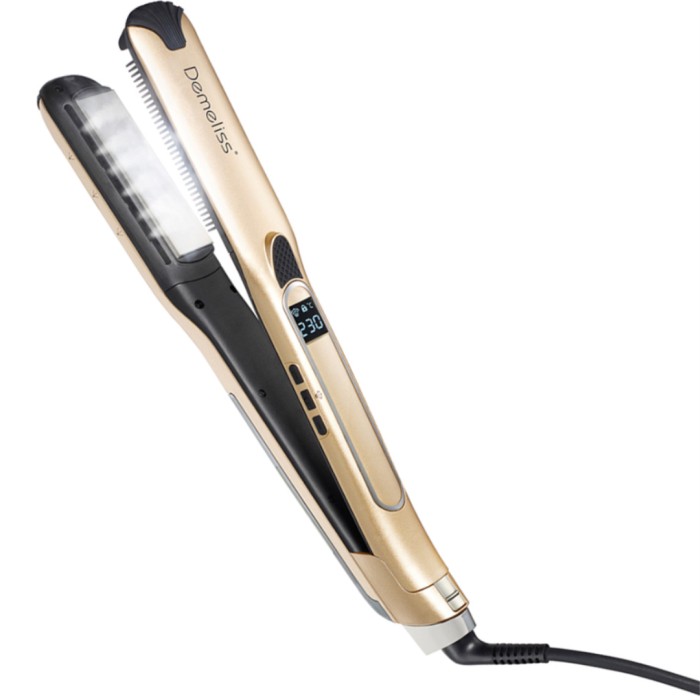 Demeliss TITANIUM V2.0 är en avancerad plattång med inbyggd vattentank och ångfunktion, designad för att ge en skonsam och effektiv styling. Ångtekniken återfuktar håret, minskar frissighet och hjälper till att skydda hårfibrerna mot värmeslitage. Den rundade formen gör det enkelt att skapa både släta frisyrer och definierade lockar.