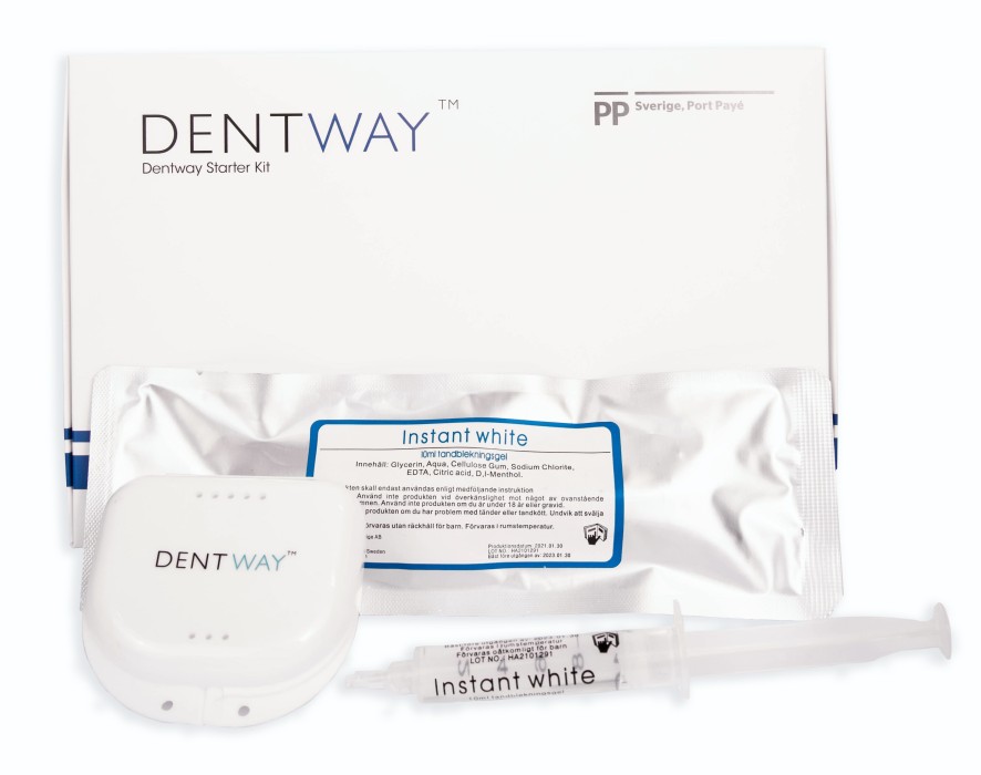 1. Doppa skenan i en skål med varmt vatten i ca 5 sekunder. 2. Skaka av vattnet. Sätt skenan över tänderna och tryck lätt med fingrarna runt om. Skenan stelnar nu och formar sig efter dina tänder. 3. Upprepa proceduren med den andra skenan. Nu är du klar.