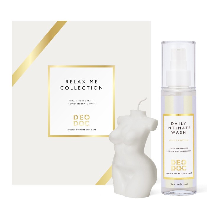 DeoDoc Relax Me Collection Candle + Daily Intimate Wash med doften Violet Cotton. Ett set som innehåller DeoDocs prisbelönta intimtvål och ett ljus format som en kvinnokropp. Ge bort som gåva eller unna dig själv för en en avslappnande stund innan eller efter duschen.