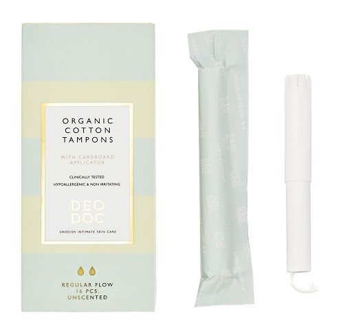 DeoDocs tamponger med applikator är tamponger av 100% ekologisk bomull. Tampongen har en skyddande hinna som motverkar att fiberrester lämnas i vaginan för att förhindra irritation, och ligger i en kartongapplikator för hygienisk och bekväm insättning.