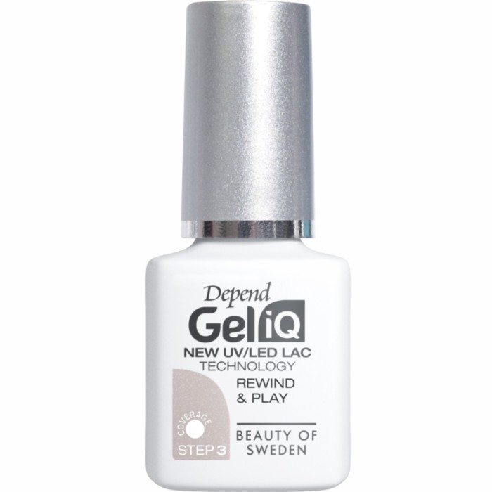 Depend Gel iQ är en lackbehandling som hjälper dig att få perfekt glansiga naglar med fem enkla steg - och som håller i upp till 14 dagar. Du behöver inte förbereda din naturliga nagel med någon primer, utan du rengör först naglarna med Gel iQ Pre-Cleanser innan du utför din lackbehandling. UV/LED-lampan som man ska använda är speciellt utvecklad med en härdningstid på 30 sekunder i varje applikationssteg. (När lampan används får du en självutjämning där eventuella ränder försvinner under härdningen, även om du inte lackat helt jämnt.) Efter att du härdat topplacket i lampan återstår rengöring med High Shine Cleanser, ett steg som ger naglarna fin glans och färgåtergivning. Lacket kan sedan tas bort med vegetabilisk specialolja i varmt vattenbad.