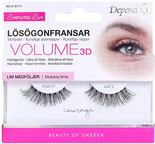 Depend Lösögonfrans Courage är en fyllig volymfrans i kortare modell med 3D-effekt. Du kan använda lösögonfransar för att intensifiera din makeup, för en look som håller hela dagen och kvällen.