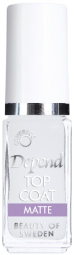 Depend Minilack nr 304 Toplack Matt är ett lack i en praktisk storlek på 5 ml. Depend Top Coat Matte ger naglarna en matt look. Överlacket torkar snabbt och är lätt att applicera med den specialdesignade penseln. Topplatcket skyddar och förlänger din färgade lackning.
