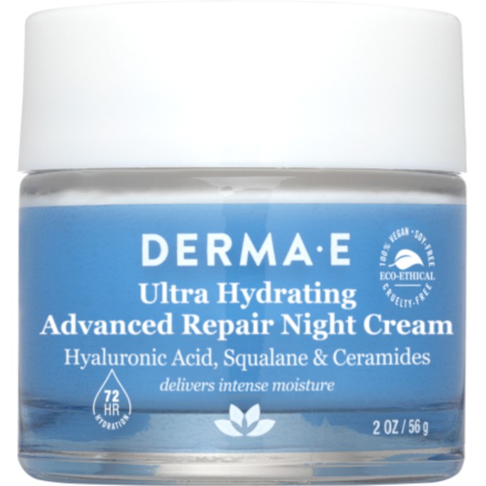 Derma E Ultra Hydrating Advanced Repair Night Cream är en intensivt fuktgivande nattkräm som innehåller ultrafuktgivaren hyaluronsyra. Derma E nattkräm hjälper till att göra huden återställd, mjuk och slät och gör att huden känns fräsch och fyllig. Balanserar och återfuktar huden under natten när du sover.