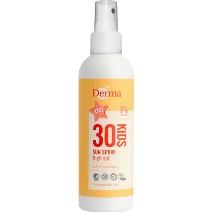 Derma Kids Sun Spray SPF30 är en oparfymerad, mycket vattenfast solsskyddspray för barn som ger effektivt skydd mot solens UVA- och UVB-strålar. Solsprayen går att använda över hela kroppen och är utvecklad för att passa barns känslig hud. Absorberas snabbt utan att kännas fet. Utan färgämnen.