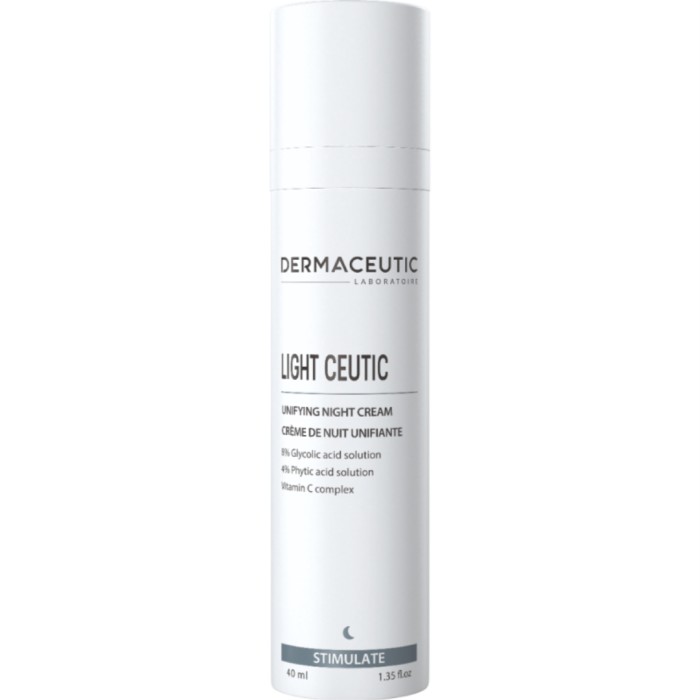 Dermaceutic Light Ceutic är en nattkräm för ojämn eller matt hud. Nattkrämen hjälper till att förebygga uppkomsten av pigmenteringar och jämnar ut hudtonen. Krämen innehåller exfolierande glykolsyra som ger en jämn hy och gör det möjligt för de övriga ingredienserna att tränga djupt ner i huden. Dermaceutic Light Ceutic innehåller även fytinsyra som hämmar bildningen av pigment och ett stabilt C-vitaminderivat som skyddar huden mot fria radikaler.