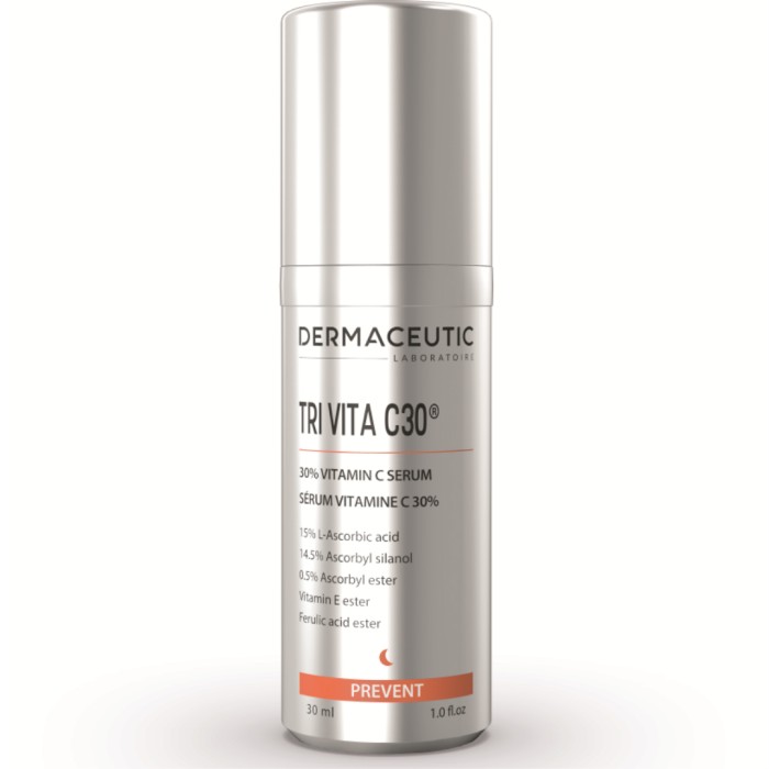 Dermaceutic Tri Vita C30 är ett mycket kraftfullt och effektivt serum som innehåller hela 30% C-vitamin. Serumet innehåller en innovativ kombination av tre former av vitamin C som gör det möjligt att nå alla hudlager och ge effekt över en längre tid. Serumet innehåller även antioxidanterna vitamin E och ferulsyraestrar som förbättrar C-vitaminets effekt.