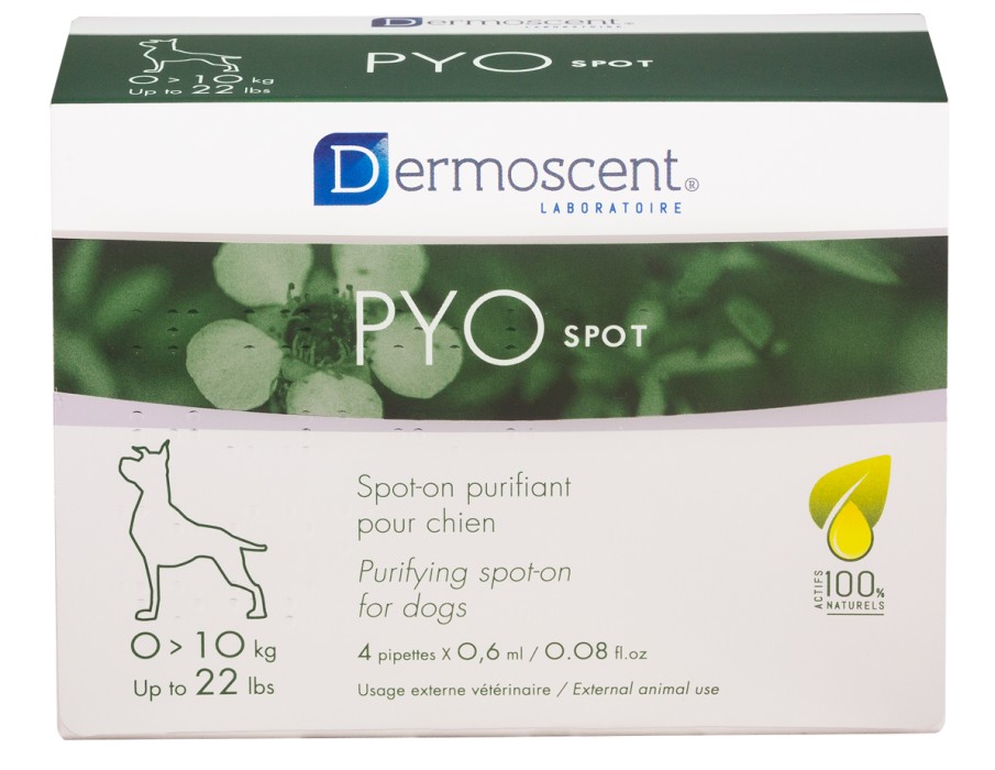 Dermoscent PYOspot 0-10 kg är en spot-on med en formulering avsedd för att rena huden på hundar som får återkommande infektioner. PYOspot innehåller naturliga aktiva ingredienser, bl a det antimikrobiella komplexet PhytoC-2, för att återställa balansen i den kutana floran och lugna huden. Förstärker hudbarriären för att bidra till att upprätthålla en god nivå av fukt.