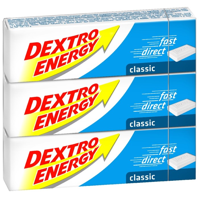 Dextro Energy är ett druvsocker som höjer blodsockernivån i kroppen och ger ett snabbt tillskott av energi. 3-pack.